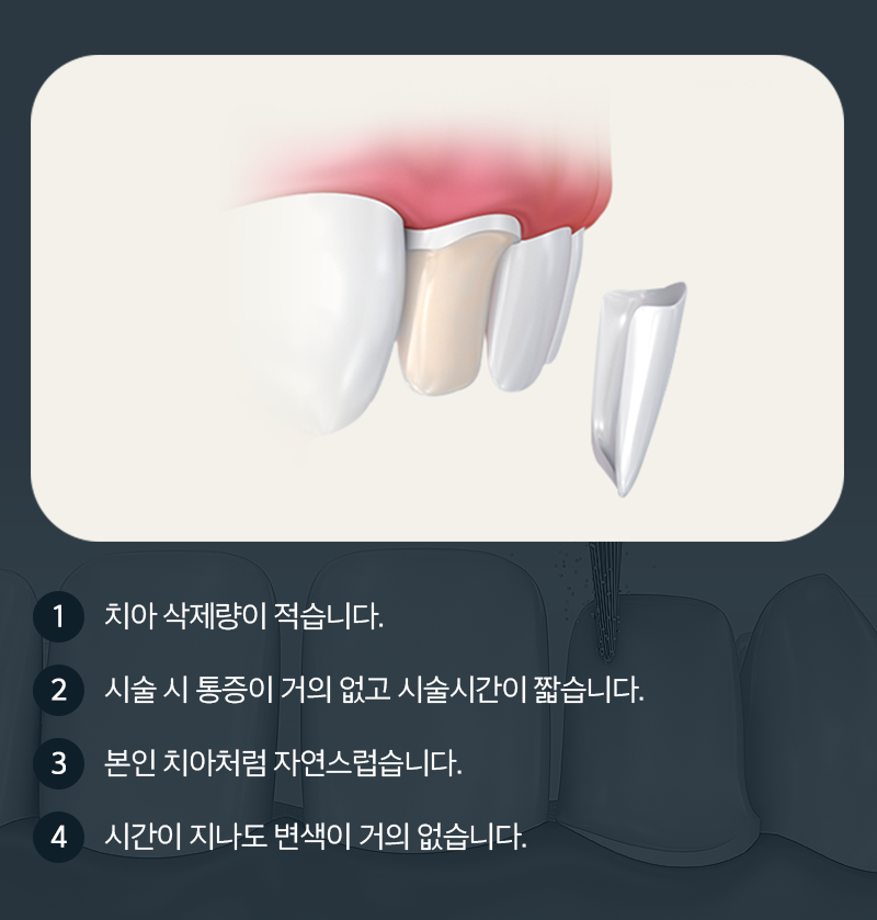 적은 치아삭제, 라미네이트치아의 바깥 면을 아주 얇게 삭제하거나 거의 삭제하지 않고,인조 손톱 모양의 얇은 라미네이트 도재를 만들어치아 표면에 예쁘게 부착하는 치료입니다.