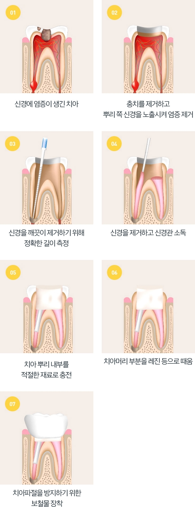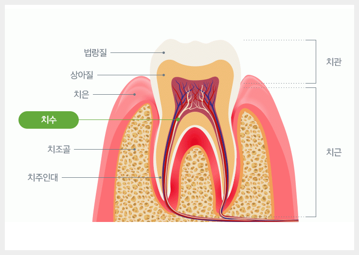 치아의 신경(치수)이 충치의 세균에 의해 감염되거나유해한 자극 등의 이유로 염증이 발생한 경우손상된 신경조직 제거 및 신경과 혈관이 차지하고 있는부위를 깨끗하게 제거하고 그 부위에 적합한 재료로채워 넣는 치료를 말합니다.