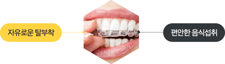 치아에 브래킷을 부착하지 않고, 투명한 아크릴 필름을 끼워 치아를 이동시키는 방법을 말하며, 투명하여 잘 보이지 않고 착탈식이라 필요시에 제거가 가능하며, 치과에서 소모되는 시간이 적고 장치로 인한 불편한 자극이 없습니다. 단, 악당 2mm 이내 정도의 공간 부족이나 틈이 벌어진 경우, 또는 치아 이동 거리가 작은 비교적 간단한 증례에 국한되어 사용되는 장치입니다.